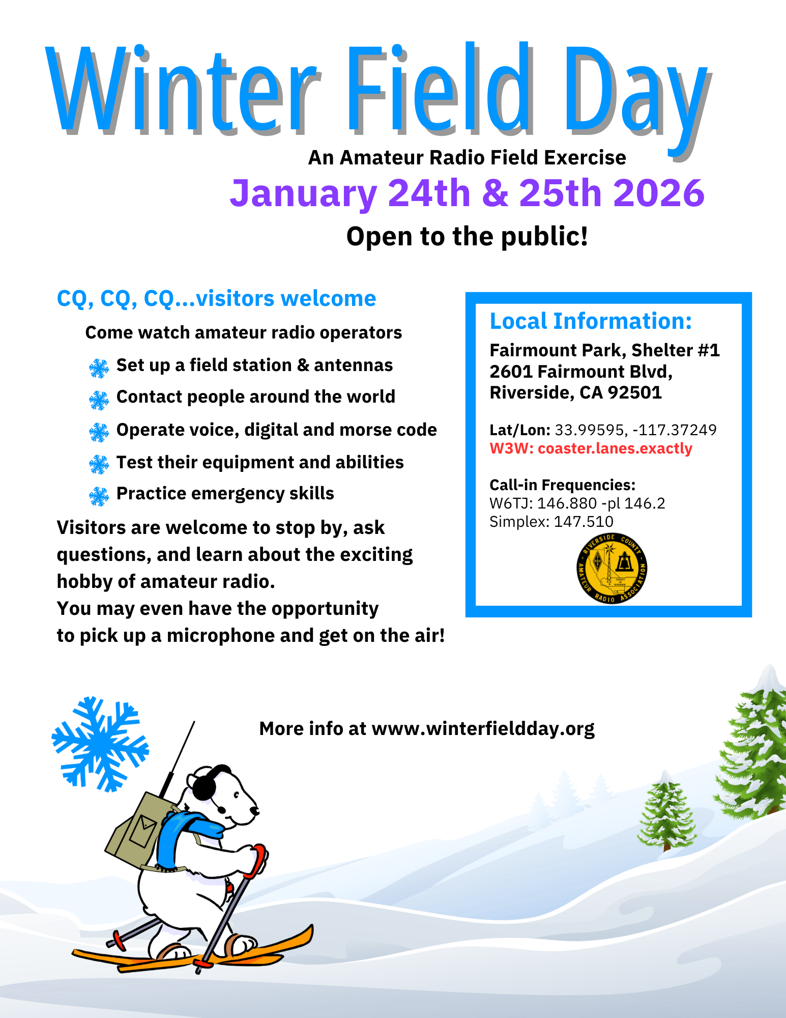 The community is invited to join the Riverside County Amateur Radio Association at Martha McLean Anza Narrows Park, 5759 Jurupa Ave., Riverside, CA for a weekend of outdoor Amateur Radio. The event is open to the public and is free of charge. The activities begin at 11:00 a.m. on Saturday and run through 11:00 a.m. on Sunday